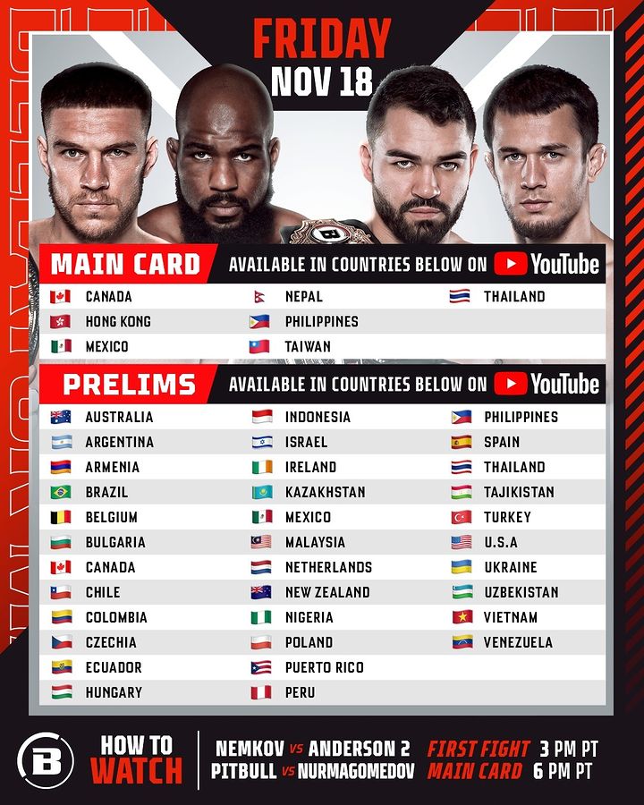 Поэтому смотреть турнир можно на YouTube в официальном канале промоушена https://www.youtube.com/c/bellator/.