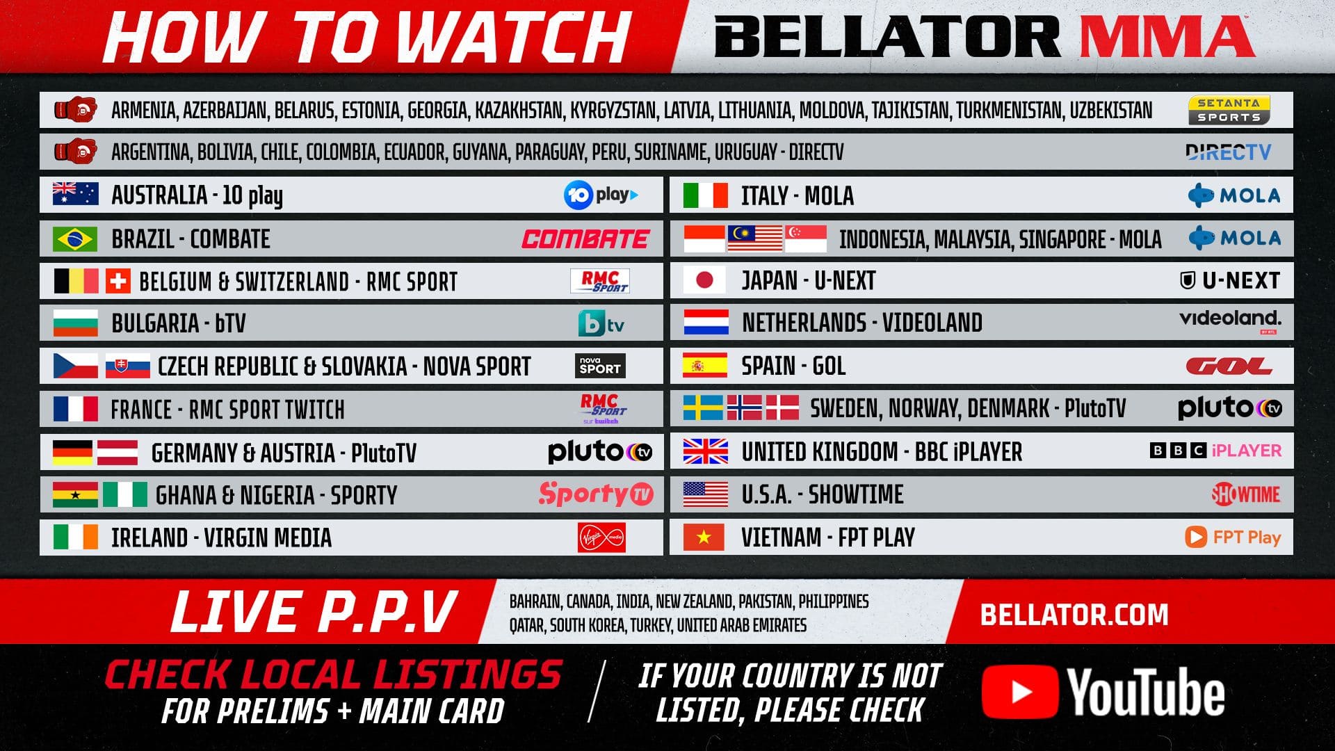 Список стран, для которых будут показывать основной кард Bellator 300 на YouTube: