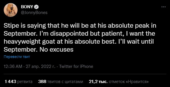 «Стипе говорит, что в сентябре он будет на пике формы. Я разочарован, но терпелив, я хочу, чтобы великий тяжеловес показал себя с лучшей стороны. Я подожду до сентября. Никаких оправданий», — написал Джонс в Twitter.